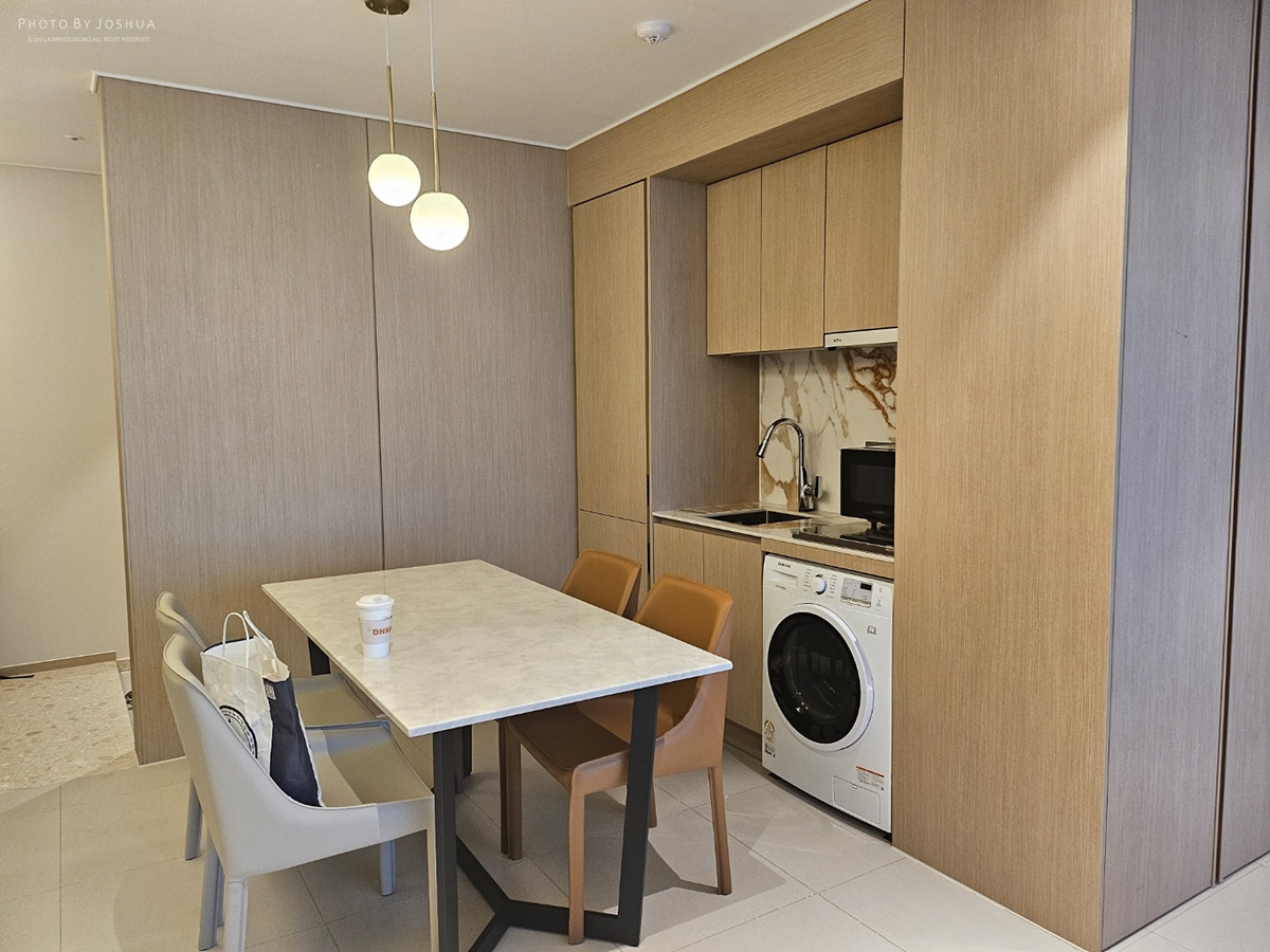 [Samsung Galaxy S23 Ultra] 숙박형 호텔인가? 전자렌지랑 세탁기도 있고 냉장고도 째매난게 아니라 제법 긴 냉장고가 수납장에 숨어있다.