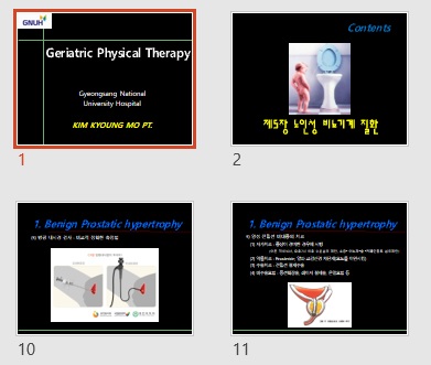 물리치료 대상자 중 많은 수를 차지하는 노인층에 대한 이해를 통해 보다 질높은 치료를 할 수 있도록 해야하겠습니다.