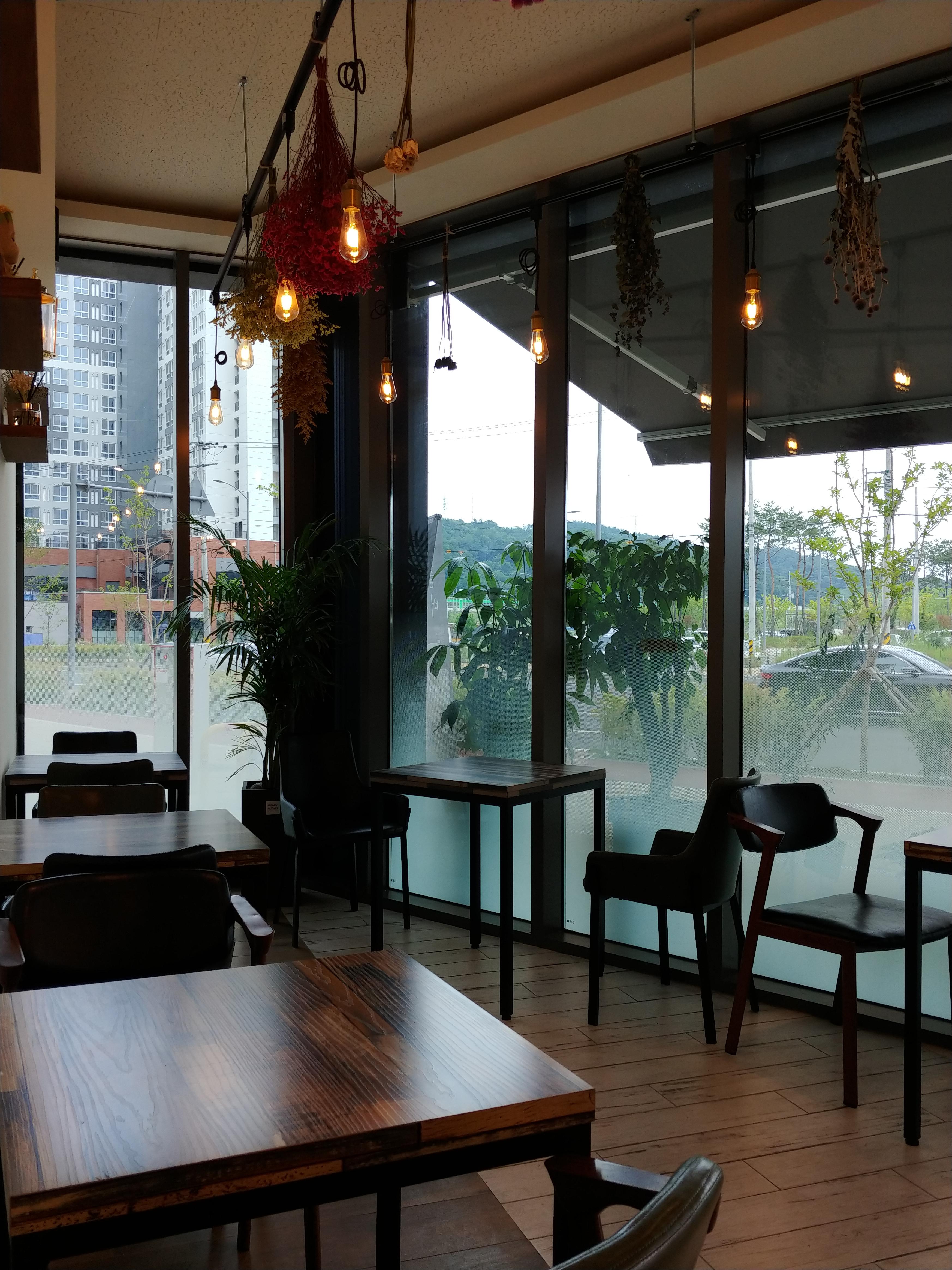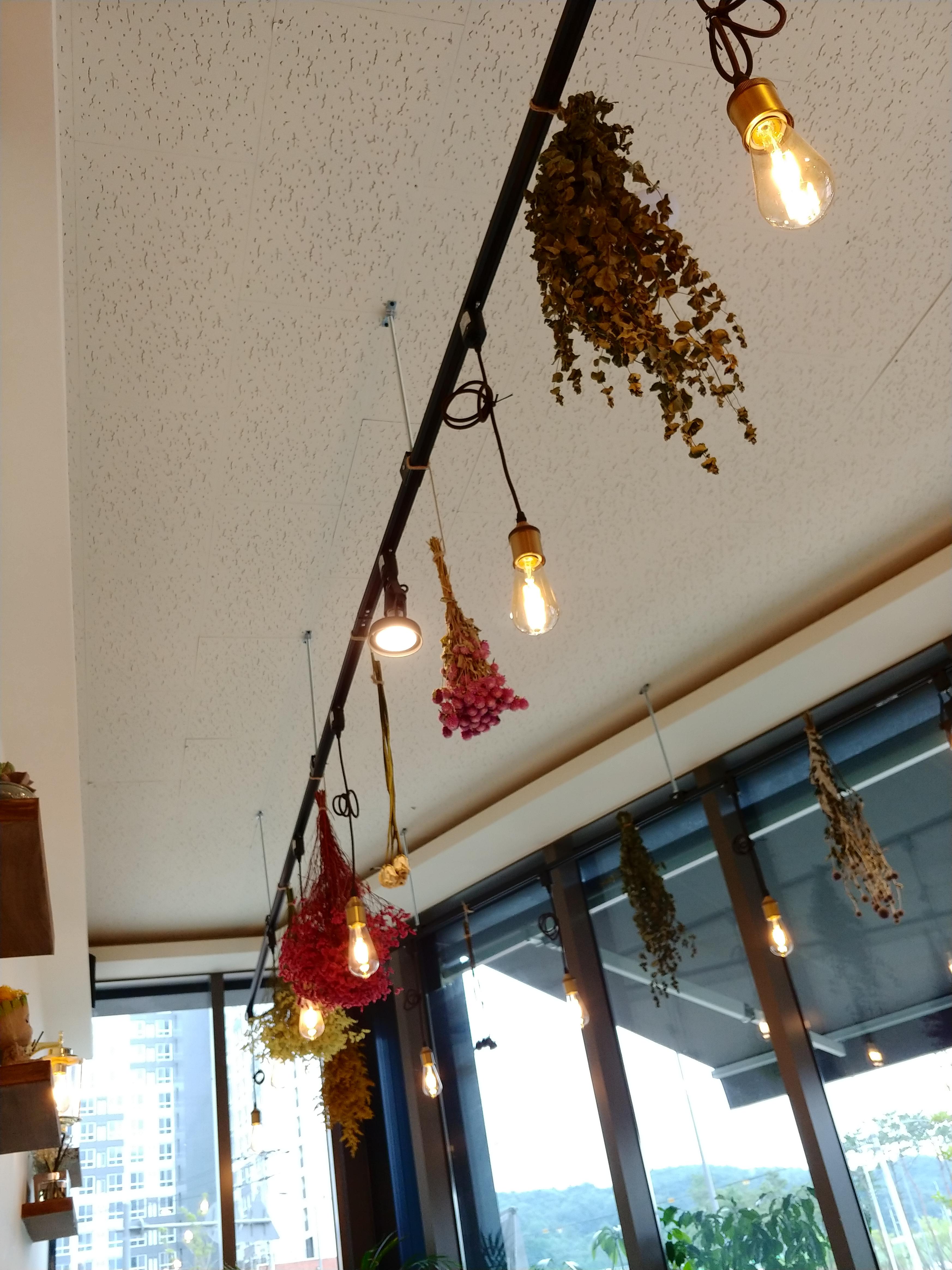 천장엔 조명과 함께 꽃들도 매달려있네. 그래서 커피향과 꽃향을 함께 느낄 수 있었다.