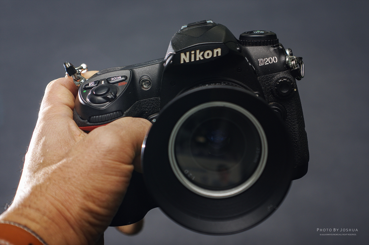 니콘D200, 니콘의 플래그십이나 풀프레임라인을 제외한 크롭라인중 고급기에 속하는 D200. 2005년 11월에 출시되었으니 15년이 지난 카메라이다. CCD 1,000만화소의 센서를 가지고 있으며 AF측거점은 11개, 후면LCD는 2.5인치 23만화소를 장착하였다. 메모리는 CF카드를 사용한다. 마그네슘 바디로 되어있어 830그램의 제법 묵직한 무게이다.