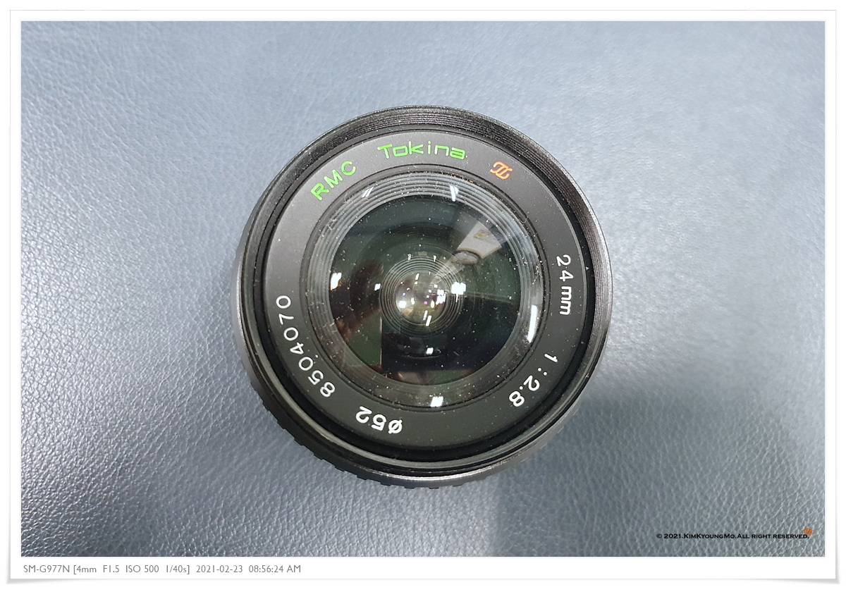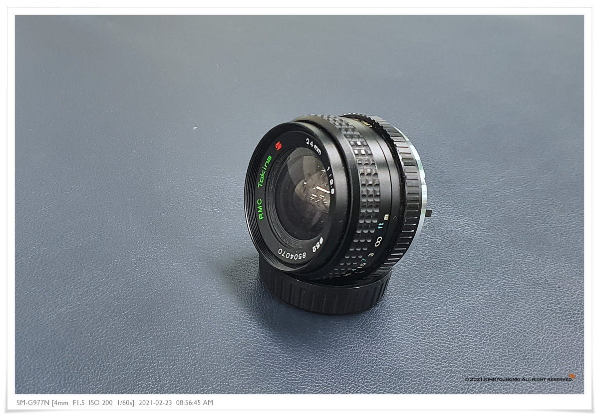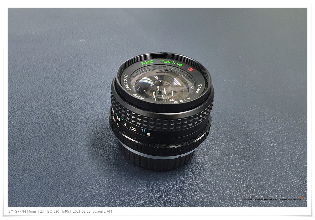 이슷디 입양하며 함께 온 렌즈. Tokina RMC 24mm f2.8 수동단렌즈이다. RMC는 레인보우멀티코팅(Rainbow Multi Coating)이라 칭하는데 뭔 뜻인지는 잘 모른다.