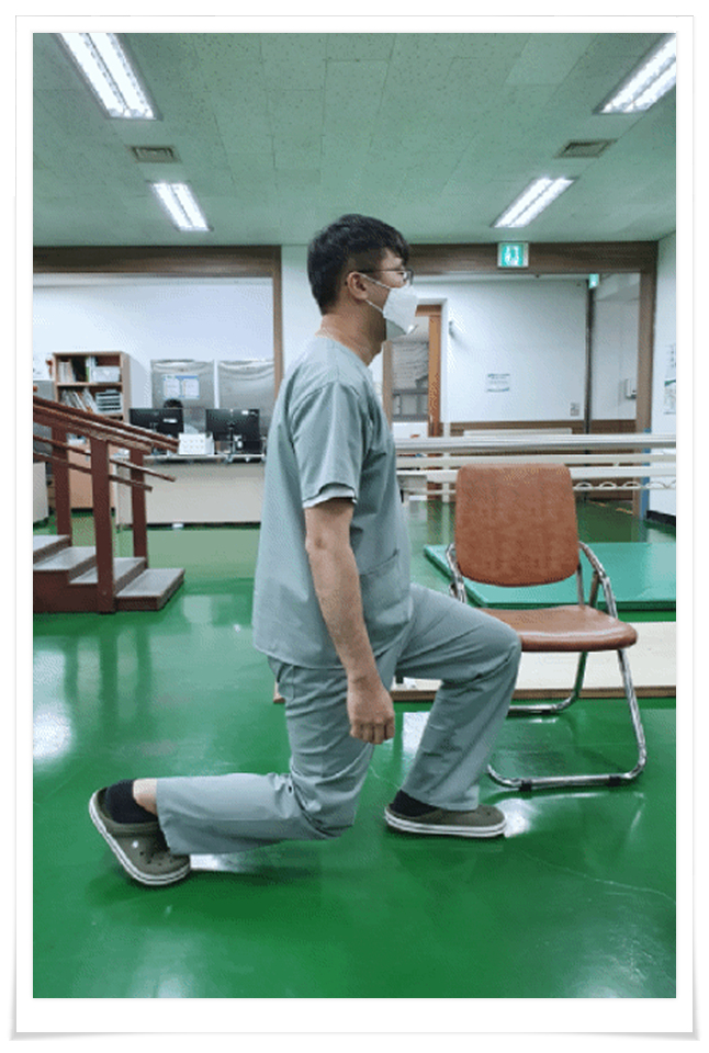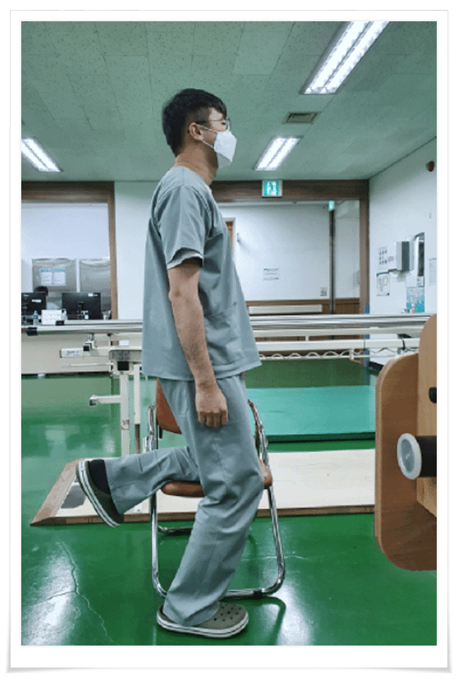 3. 의자에 한쪽 다리 올리고 반대측 다리 flexion 20도 20회 3 세트