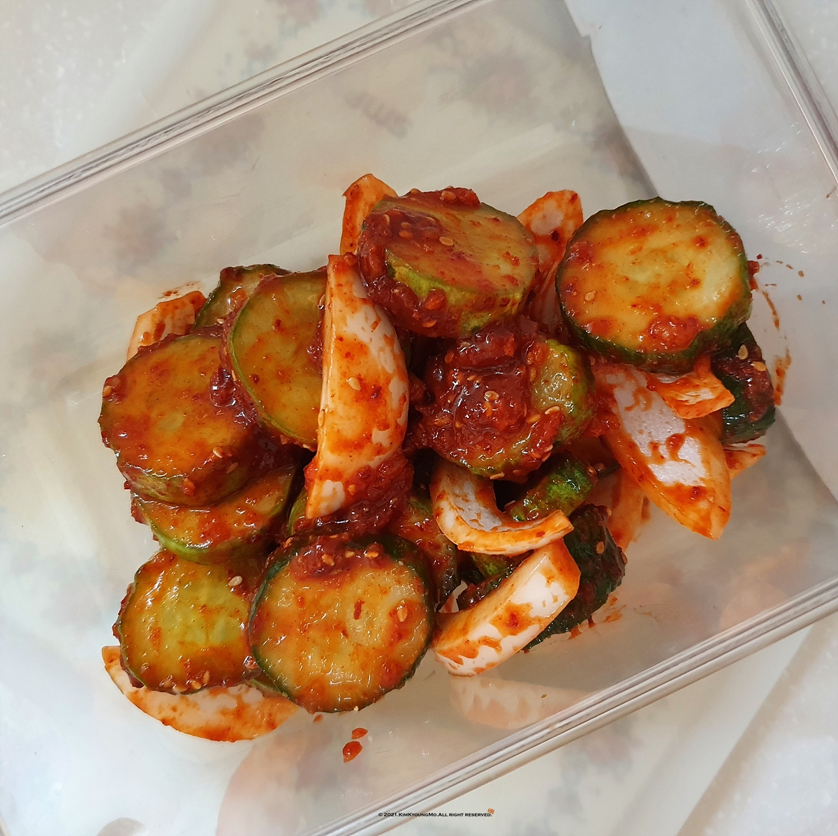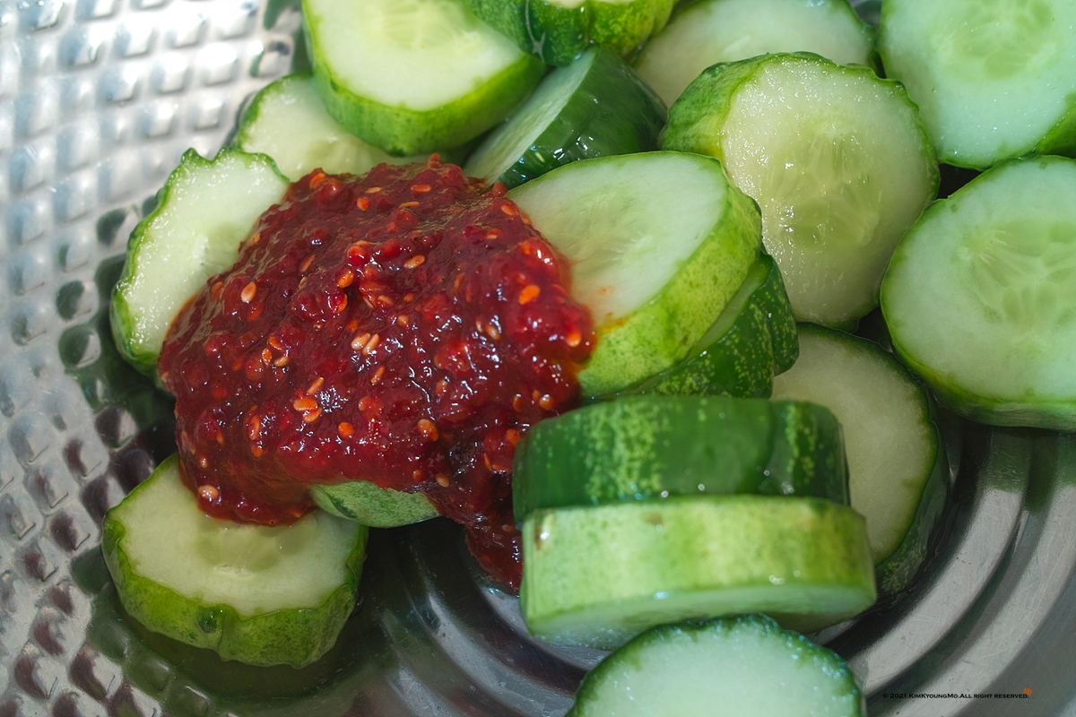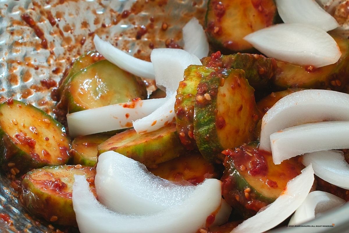오이 1개, 양파 쪼금, 소금 쪼금, 고추장 1숟갈, 고춧가루 1숟갈, 간장 반숟갈, 설탕 반숟갈, 식초 1숟갈, 다진마을 반숟갈, 참깨 적당히