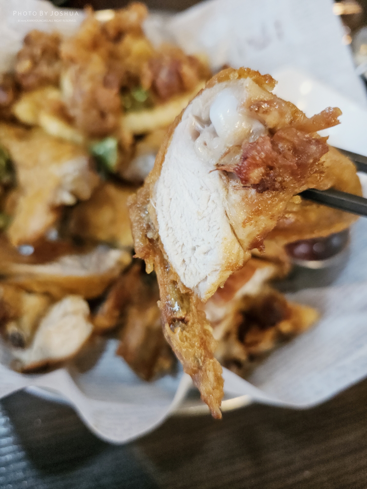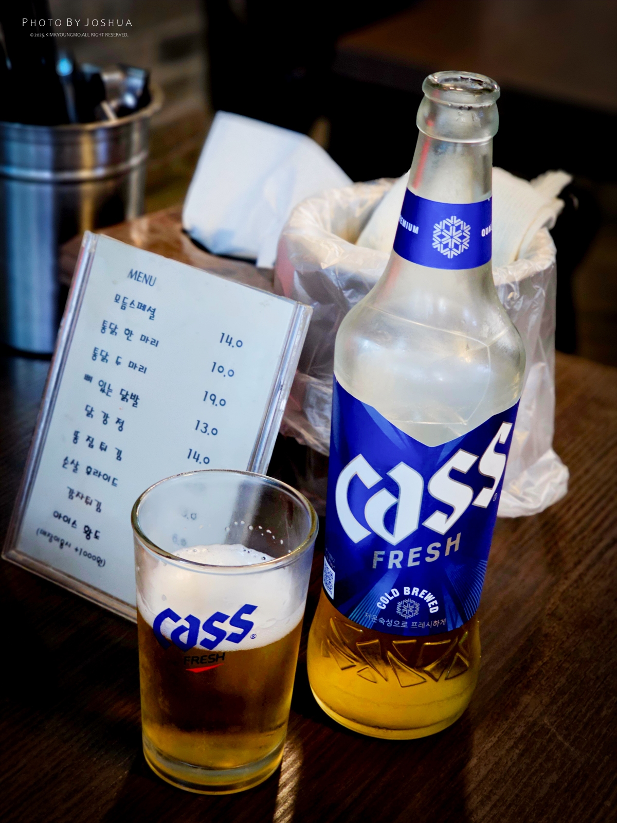 오픈형주방이라 사장님이 호쾌하게 닭 튀기는 장면을 직접볼수있는게 장점이랍니다. 홀에 자리가 있고 운이 좋다면 구석에 작은 방이 있는데 독립된 공간처럼 되어있어 오븟하게 술마시기 좋습니다. 치맥이 진리라지만 치킨엔 소주가 어울리기도 하지요.