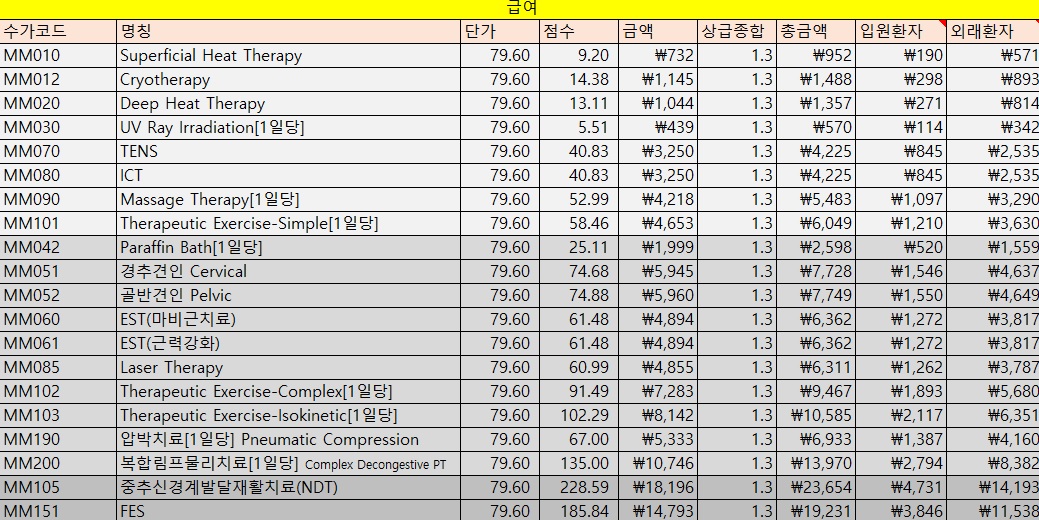건강보험공단심평원에서 제공하는 급여비용 중 물리치료에 관련된 항목만 정리하였습니다. 단가는 매년 달라질 수 있으며, 곱하기함수가 몇군데 들어가 있는데 상급종합 항목의 경우는 병원에 따라 숫자를 바꿔주면 뒤에 금액이 같이 변합니다(상급종합병원은 금액의 30%가 가산됩니다. 그래서 1.3 곱하기 한 금액이 총 금액으로 나옵니다.