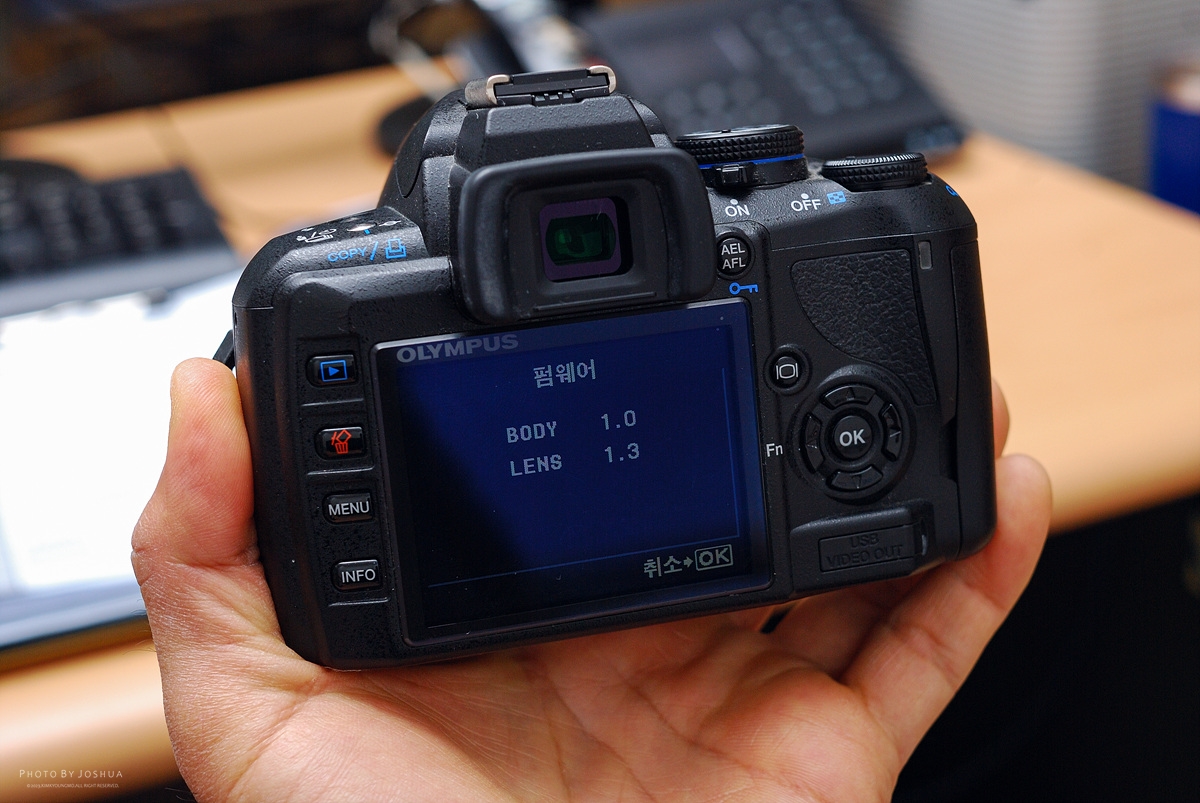 판매자분이 보내주신 소중한 박스. 안전하게 잘 도착뚜껑을 여니 완충제 사이로 올림마크가 살짝 보인다. 두근두근. 올림은 처음이라.따단~ 렌즈는 바디에 붙어왔으며 호환충전기가 함께 왔다.젤 먼저 때빼고 광내고 펌웨어 부터 확인하니 바디 1.0, 렌즈 1.3 이라고 되어있었다.홈페이지에 찾아보니 e-450은 펌웨어 업데이트가 없으며 렌즈는 1.3이 맞다. 그럼 최신화 다 된거임.케이블 산 김에 다시한번 더 확인. 역시 e-450은 펌웨어가 1.0에서 끝임.올림푸스만의 특이한 USB 단자. 물론 쓸일은 없다.인터넷에 찾아보니 올림바디의 정보를 볼 수 있는 방법이 있었다. 찾아보니 내껀 5,155컷.